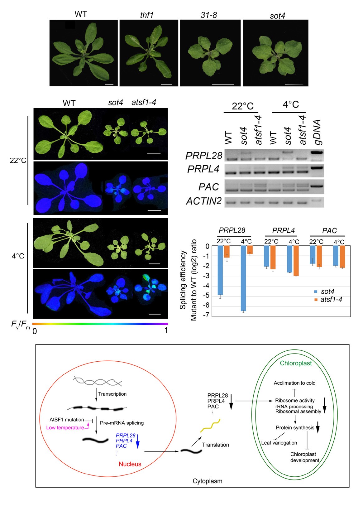 黄继荣课题组一直致力于核基因编码的叶绿体蛋白质THF1 (THYLAKOID FORMATION1)的功能与作用机理研究。基于THF1突变产生斑叶的表型,课题组通过构建thf1为背景的突变体库,筛选斑叶表型消失的突变体,获得了一系列thf1的回复子,发现多个回复子编码定位于叶绿体的核糖体亚基及核糖体活性调节因子,表明thf1斑叶表型与叶绿体翻译过程高度相关。与之前报道的斑叶回复子都编码定位于叶绿体的蛋白质不同,本研究介绍了一个新型的斑叶回复子,命名为sot4,其编码一个定位于细胞核并在真核生物中高度保守的RNA剪接因子(Splicing Factor1,SF1)。sot4属于错义点突变,导致第198位的甘氨酸残基变成了精氨酸残基(SF1G198R)。sot4与完全敲除突变体一样,呈现植株矮小、短根、对激素ABA超敏感,以及在低温(4℃)下生长出现新叶严重黄化但能慢慢转绿的表型。