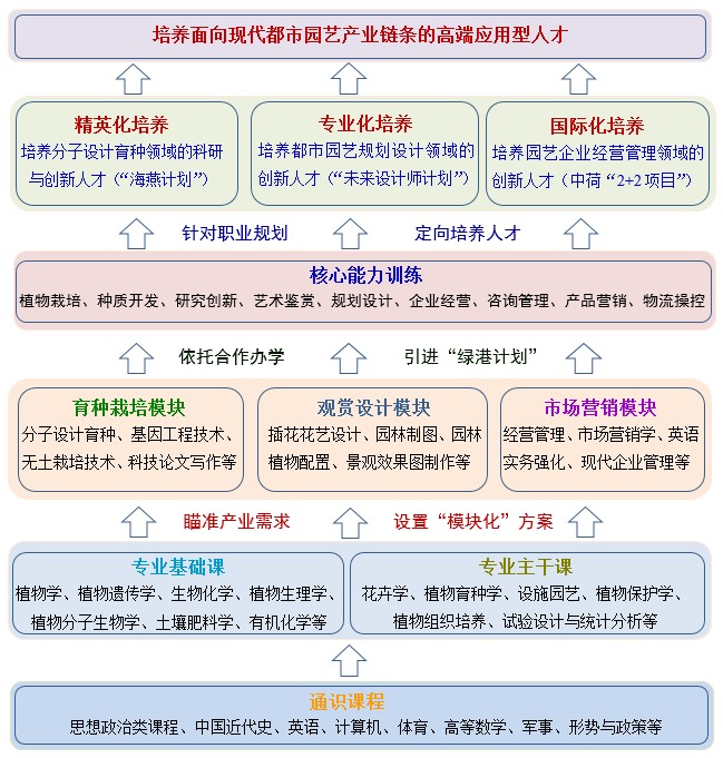 (1)根据都市园艺产业需求,制定精准化、模块化、精英化的培养方案。主要包括:针对学生职业规划,制定“模块化”培养方案;锁定都市产业需求,“精准”增设实践课程;对标园艺职业标准,建立“以能力训练为核心”的课程大纲;依托优势学科平台,通过实施“海燕计划”开展“精英化”教学,即选拔10-15%综合素质好的学生,从第3学期开始进入各个研究组长(PI)的科研实验室,进行“精英化”培养。