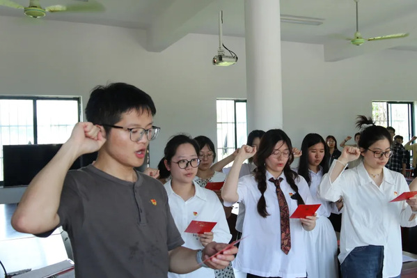 初心承启宣言,牢筑理想信念。在庄严的党旗下,由杨华琛作为领誓人,戴绍军老师作为监誓人,新发展党员们高举右手,面对党旗庄严宣誓。一声声坚定的誓言,表达了他们对党的忠诚与热爱,以及为共产主义事业奋斗终身的决心。