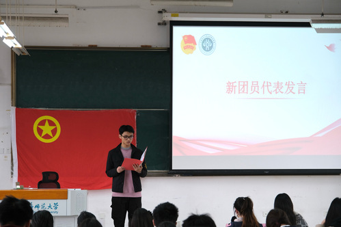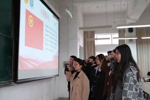 由院团委(学生)副书记胡铭源带领全体新发展团员面向团旗举起右手,庄严宣誓。坚决拥护中国共产党的领导,遵守团的章程,执行团的决议,履行团员义务,严守团的纪律,勤奋学习,积极工作,吃苦在前,享受在后,为共产主义事业而奋斗。