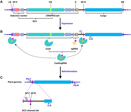 (A)T-SAFE系统由四个模块组成:选择标记(selection marker)、CRISPR/Cas9、SP(SP-F和SP-R,序列方向相反)和递送的DNA(Cargo)。(B)DNA整合到植物基因组后,sgRNA引导Cas9有效切割SCC两端的SP。(C)自我消除SCC后,无选择标记的目标DNA成功地送到植物基因组。引物对F1/C-R和F2/C-R分别用于检测植物中整合片段是否含有SCC。采用TAIL-PCR扩增整合片段侧翼的植物基因组序列。根据TAIL-PCR结果,设计了两对引物PG-F/C-R和PG-F/PG-R,用于鉴定基因组DNA片段与SCC切割后的目标DNA片段的整合情况。