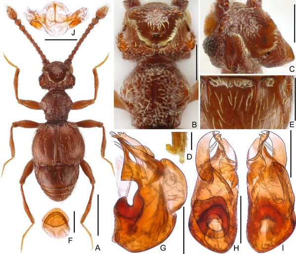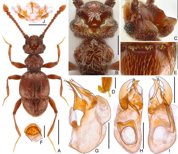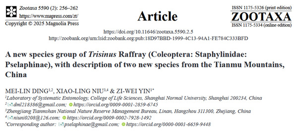 近日,我院生物科学卓越创新班2022级本科生丁美琳以第一作者身份在国际动物分类学期刊《Zootaxa》发表题为“A new species group of TrisinusRaffray (Coleoptera: Staphylinidae: Pselaphinae), with description of two newspecies from the Tianmu Mountains, China”的研究论文。该研究首次报道天目山脉幻角蚁甲属(Trisinus Raffray)两个形态奇特的新物种,并建立一新种组。研究结果丰富了该地区隐翅虫科区系,为进一步澄清华东地区昆虫多样性提供了基础科学资料。