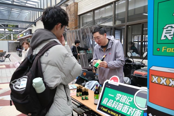 科普队成员张轩睿同学等(大三)正在向同学们介绍食品标签