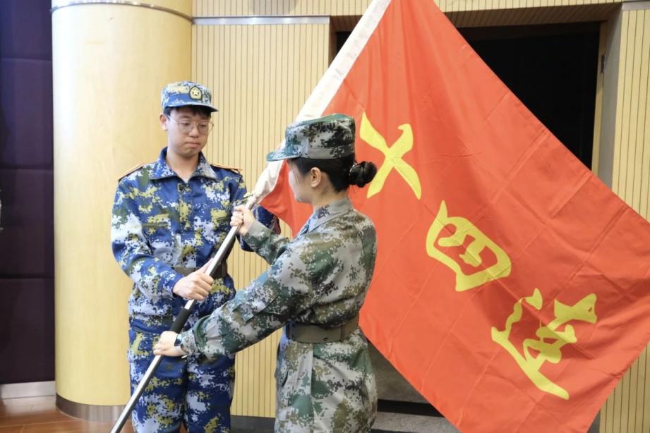 在全场庄重的注目礼下,象征着十四连荣誉与使命的连队旗帜被郑重交予旗手,随后,四位排长为四位副排长佩戴了副排长袖标。这一仪式,不仅是对骨干力量的信任与重托,更是对全体参训学员的集体荣誉感和责任感的强烈召唤,激励着每一位参训同学在军训中肩负起自己的责任,为连队的荣誉而努力奋斗。