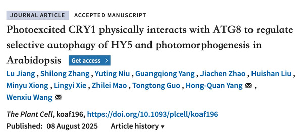 近日,151amjs澳金沙门杨洪全教授团队在植物生物学权威学术期刊The Plant Cell在线发表了题为“Photoexcited CRY1 physically interacts with ATG8 to regulate selective autophagy of HY5 and photomorphogenesis in Arabidopsis”的研究论文(https://doi.org/10.1093/plcell/koaf196),报道了蓝光受体隐花素CRY1通过抑制HY5的选择性细胞自噬来介导蓝光信号促进植物光形态建成的分子机制。