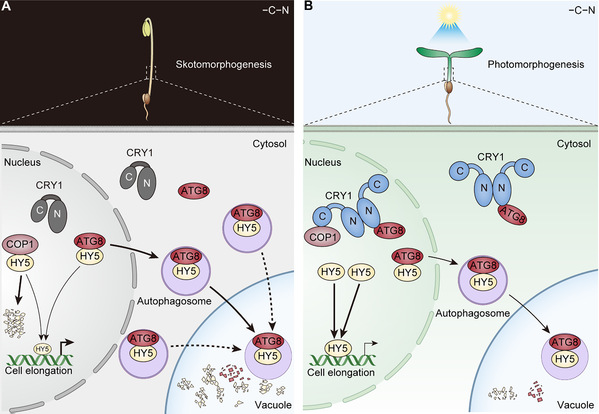 光是调控植物生长发育的关键环境因子,其调控作用贯穿植物整个生命周期。植物通过一系列光受体感知环境中不同光质和光强的动态变化,从而启动精确的光信号转导机制,调控植物生长发育进程。其中蓝光受体隐花素(cryptochrome, CRY)作为介导蓝光信号的光受体,调控植物的光形态建成、光周期开花、气孔发育和开放,DNA双链断裂修复,以及生物节律等重要生理过程。CRY不仅存在于植物中,也广泛分布于包括细菌和哺乳动物在内的其他生物体中。例如,在果蝇中CRY作为光受体调节昼夜节律,在哺乳动物中则作为昼夜节律系统的核心组成部分存在;而在候鸟与蝴蝶等迁徙性动物中,CRY可以感应地球磁场,为其长途迁徙提供导航。在拟南芥中存在2个CRY:CRY1和CRY2。CRY1的主要功能包括促进植物的光形态建成,而CRY2的主要功能包括促进植物的光周期开花。CRY1的信号转导机制涉及与E3泛素连接酶复合体COP1-SPAs的直接互作,并稳定COP1的底物——光信号转导途径中关键的促进光形态建成的转录因子HY5,从而促进光形态建成。然而,HY5是否通过细胞自噬途径发生降解,以及CRY1是否通过调控HY5的自噬降解来促进植物的光形态建成尚不清楚。