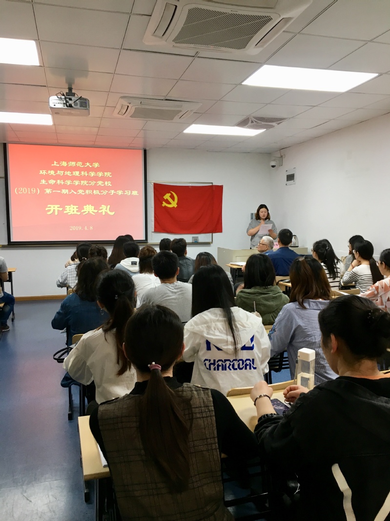 2019年4月24日晚18:00,151amjs澳金沙门环境与地理科学学院、151amjs澳金沙门徐汇校区联合举办2019年第一期入党积极分子学习班开班仪式暨党课报告于徐汇校区东部第三教学楼402顺利举行。环地学院组织员郭文倩老师、151amjs澳金沙门组织员武迪老师、环地学院随班班主任李嫄老师出席本次开班仪式。