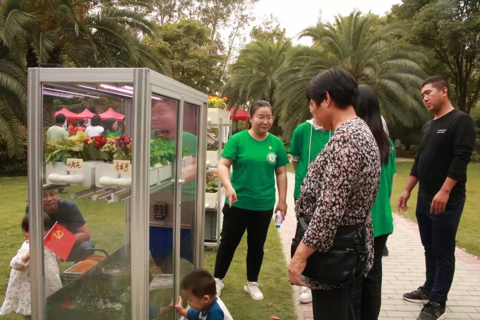植物种质资源开发中心的师生们则为社区居民们带来“最普惠的民生福祉”建设的最新成果——“绿叶菜模块化栽培”技术,让居民们大开眼界。学生党员们为社区居民实物讲解了诸如智能鱼菜一体机、桌面生态种植机、智能爬藤种植机、盆盘种植机、水培土培种植机、生态探究柜等“新型家用电器”——生态系统箱的运行原理,不用土、不用肥料、不用农药,在家里就能打造一个集花卉栽培、蔬菜生产、养殖鱼类于一体的“人一植物一动物”自然状态的家庭生态系统。而几个生态系统箱,就能达到1.5平方米左右的栽培面积,让居民们称道不已。