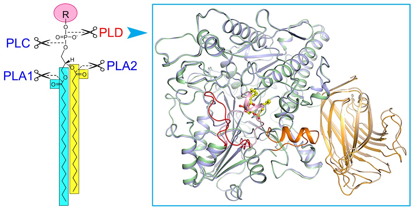 图1、磷脂酶D及晶体结构。左图显示不同磷脂酶(PLA1、PLA2、PLC、PLD)催化磷脂水解的位点,右图为磷脂酶D与产物磷脂酸(黄色棍棒模型)结合前后的三维结构叠加图,显示底物结合前后的构象变化。