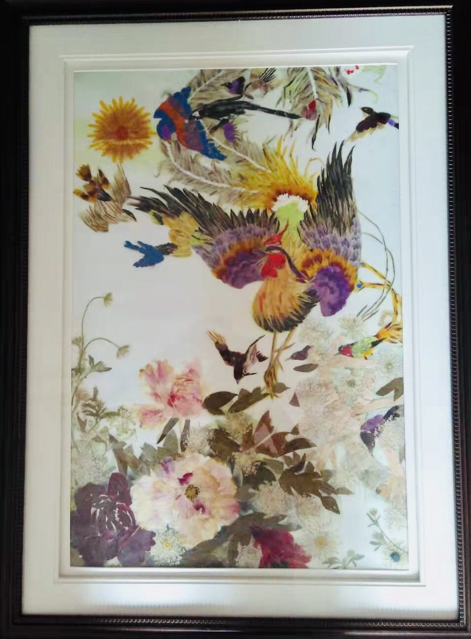丹凤朝阳一词出自《诗经·大雅·卷阿》:“凤凰鸣矣,于彼高冈。梧桐生矣,于彼朝阳。”作品选择花王牡丹(象征富贵吉祥)、丹凤和群鸟共舞在北京世园会,描绘了“盛世中华,国富民强”美好景象。