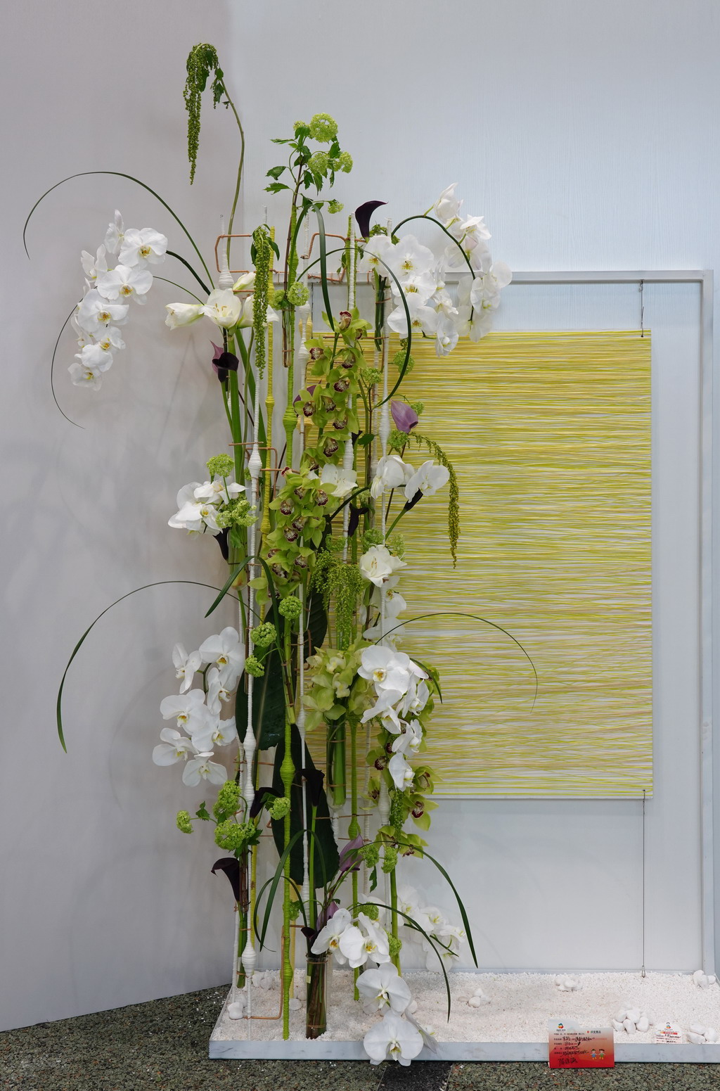 作品具有浓烈的中国传统风韵和丰富的色彩感与层次感,白色朱顶红纯洁高雅,焦点处帝王花大气华贵,白色落新妇俏丽可爱,飘舞的书带草寓意风从东方来,点睛之笔选择柔枝如影随形的云南黄馨以曲干式构成不等边三角形构图,增加了作品的轻盈感,如一位少女轻歌曼舞迎接春的到来。