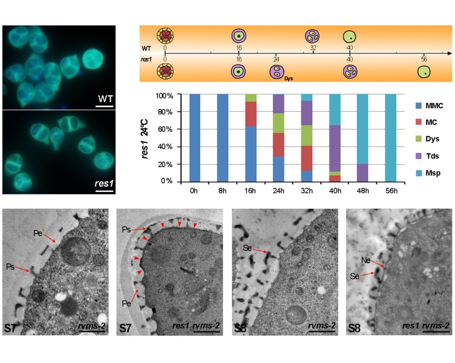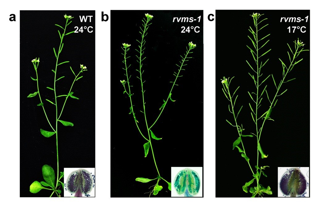 低温延缓植物生长发育是普遍的现象。因此,作者推测低温下发育速度的减缓有助于rvms小孢子积累足够的原料,发育成为有功能的花粉粒。为了证明这一点,作者利用化学诱变筛选到了rvms突变体的恢复子res1,是细胞周期蛋白依赖激酶CDKA;1的一个弱突变体。该突变体的减数分裂过程显著延长,从而有效保护小孢子发育进程。此外,rvms-1与一个生长缓慢的突变体chlm-4杂交后,其双突变体也能部分恢复育性。这些结果都表明,低温导致的缓慢生长是rvms育性恢复的机制。