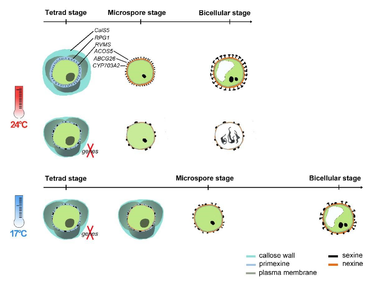 该研究发现一些与花粉外壁形成相关的不育突变体,如花粉壁模式建成相关的cals5,rpg1;与孢粉素合成相关的acos5,cyp703a2;以及与孢粉素转运相关的abcg26等突变体,在低温下也能恢复育性,表明这些突变体也是温敏突变体。恢复子res1也能恢复上述突变体的育性,表明缓慢生长也是这些温敏突变体育性恢复的机制。低温下植物生长缓慢是自然界的普遍现象,高等植物的生殖发育过程高度保守。因此,该论文提出缓慢生长是植物温敏不育恢复的一个普遍机制。