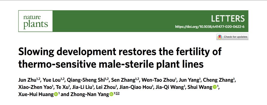 2020年 3月 30日,杨仲南教授团队于《自然—植物》发表了题为“Slowing development restores the fertility of thermo-sensitive male-sterile plant lines”的研究论文,该研究揭示了植物温敏育性转换机制。