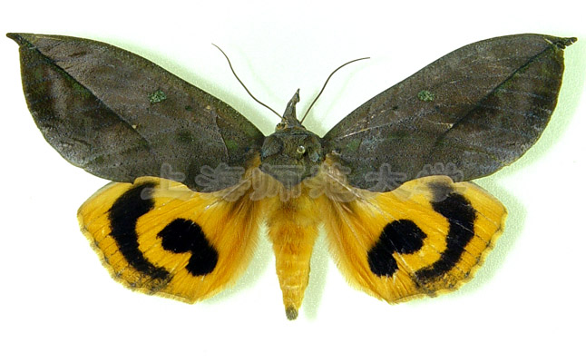 枯叶夜蛾翅展约95mm。前翅褐色,顶角突出,后翅黄色,具肾形和月牙形黑斑。停息时极象枯叶。