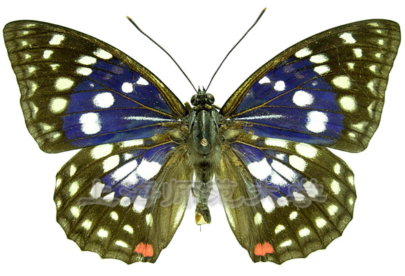大紫蛱蝶翅展86~110mm。翅紫黑色,有白色斑点点缀其中,雄蝶的翅具强烈紫色虹彩,后翅臀角具粉色斑。是日本的国蝶。