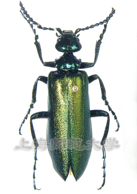 绿芫青体长12~21mm。全身绿色有金属光泽,成虫取食豆科植物。