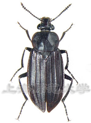 黑角葬甲体长约16mm。黑褐色,鞘翅长度超过腹部末端。